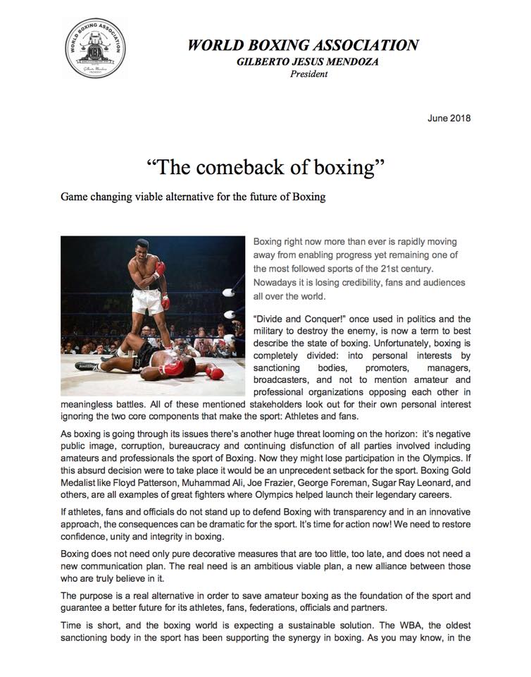 Thus, we invite you: National Federation, Athlete, official, trainer, and professional, who recognizes themselves in this initiative to engage in this movement. It is time to face the modern world and time to strive forward with the biggest comeback ever: "The comeback of boxing,"