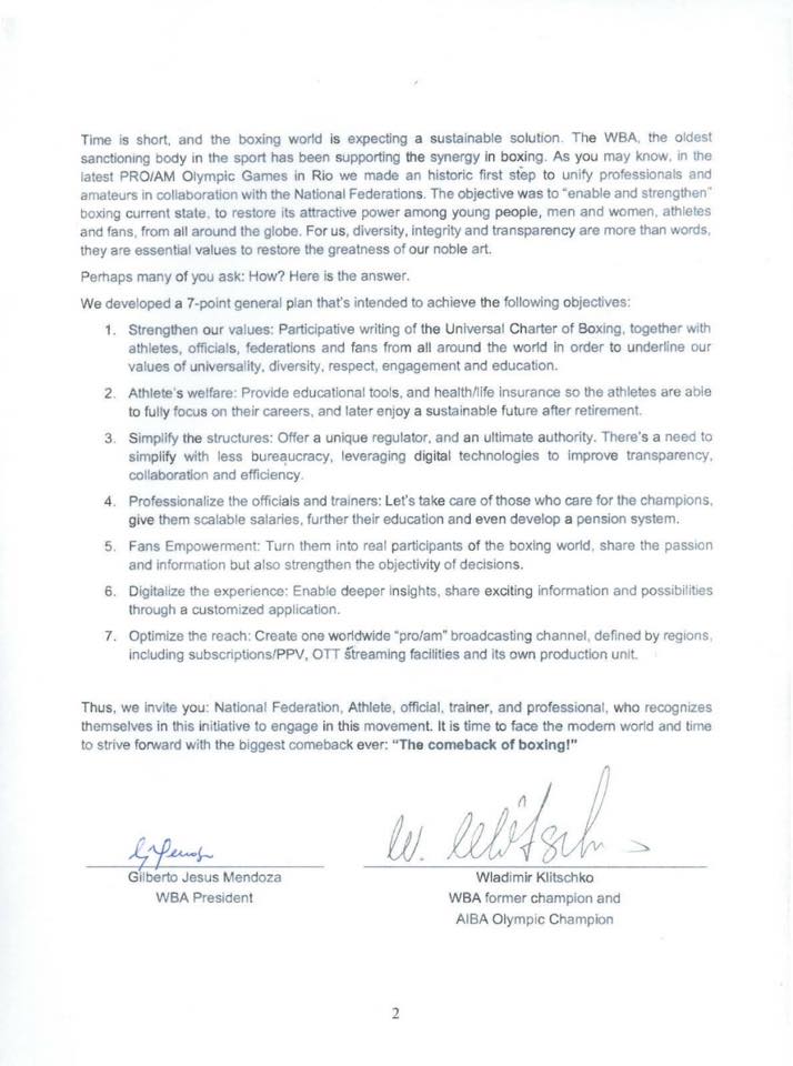 Time is short, and the boxing world is expecting a sustainable solution. The WBA, the oldest sanctioning body in the sport has been supporting the synergy in boxing. As you may now, in the latest PRO/AM Olympic Games in Rio we made an historic first step to unify professionals and amateurs in collaboration with the National Federations. The objective was to -enable and strengthen' boxing current state, to restore its attractive power among young people, men and women, athletes and fans, from all around the globe. For us, diversity, integrity and transparency, are more than words, they are essential values to restore the greatness of our noble art.